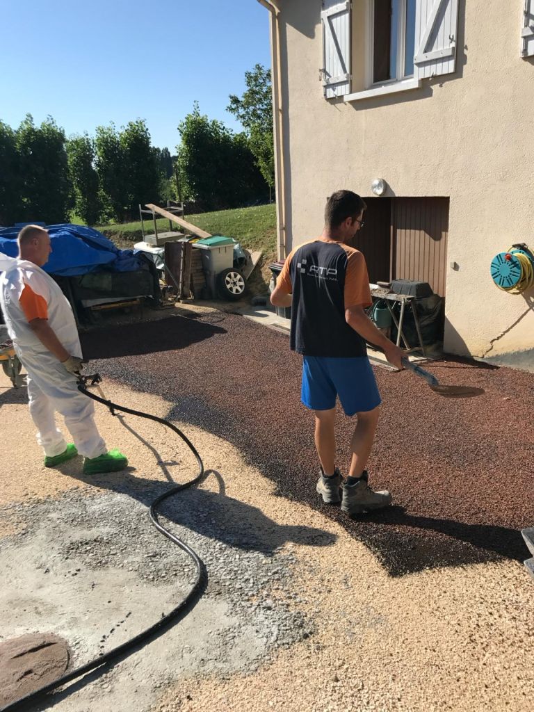 Les équipes Rousselat Travaux Publics ont aménagé une cour en gravillonnage bicouche pour un particulier, avec une finition rose porphyre élégante et résistante.